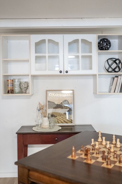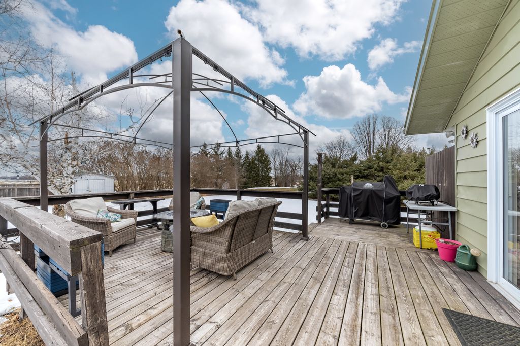 Inside the home, the open-concept design features a spacious living room, updated kitchen with stainless steel appliances, and a bright dining area with patio doors leading to a deck and gazebo, offering a private and scenic view. The main floor also includes a large primary bedroom with a 2-piece ensuite, a second bedroom, a renovated main bathroom, and a flexible room currently serving as an office and pantry. This space could easily be converted into a laundry room again if needed.